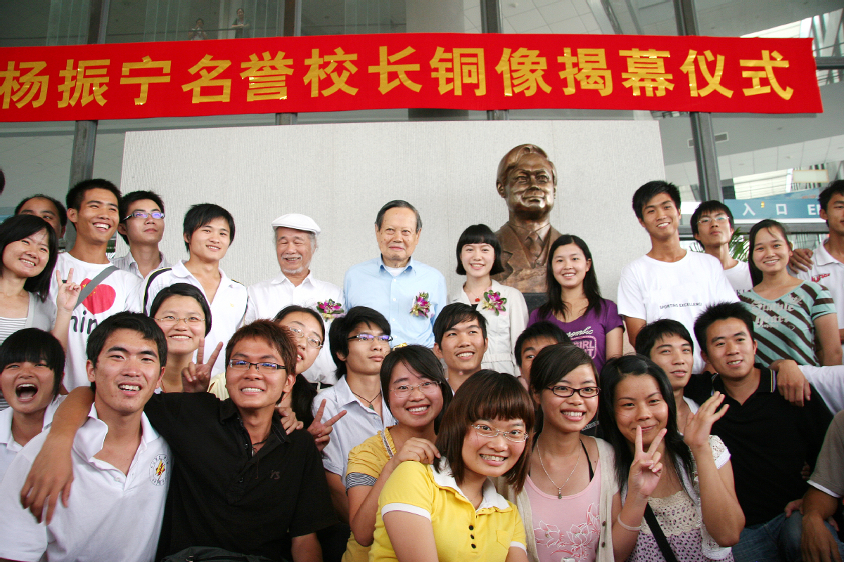 ▲2009年5月,杨振宁与学生在铜像前合影