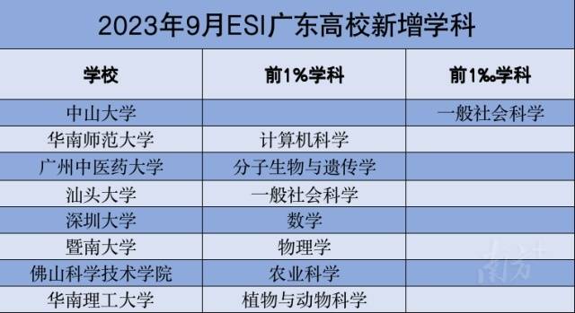 从新增学科来看,中山大学新增的前1‰学科、汕头大学新增的前1%学科,均为一般社会科学。其余全球前1%学科中,包括华南师范大学的计算机科学、广州中医药大学的分子生物与遗传学、深圳大学的数学、暨南大学的物理学、佛山科学技术学院的农业科学、华南理工大学的植物与动物科学。