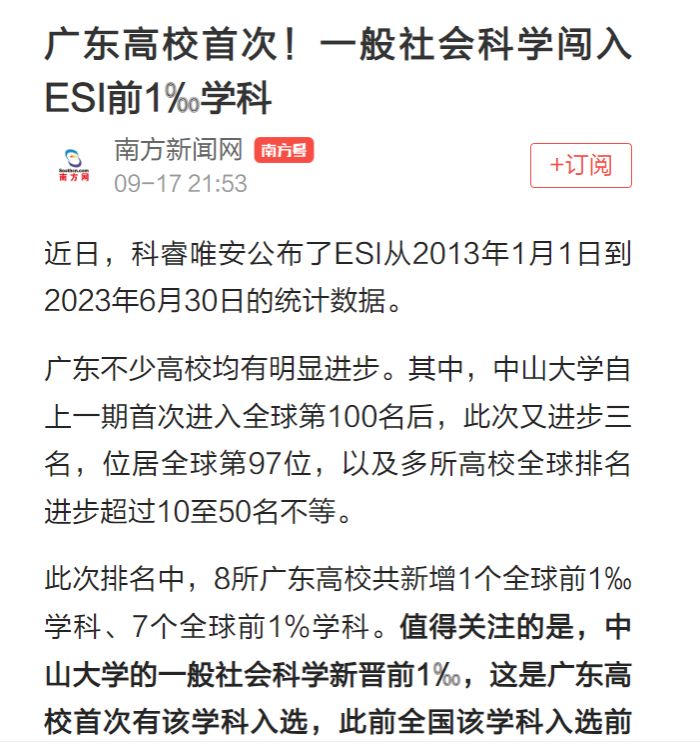 此次排名中,8所广东高校共新增1个全球前1‰学科、7个全球前1%学科。值得关注的是,中山大学的一般社会科学新晋前1‰,这是广东高校首次有该学科入选,此前全国该学科入选前1‰的高校仅有北京大学。