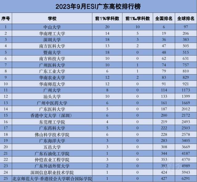 在此次ESI排名中,广东25所高校共有24个学科入选全球前1‰、197个学科入选全球前1%。其中,中山大学入选学科数量稳居榜首,分别拥有10个前1‰学科、20个前1%学科。