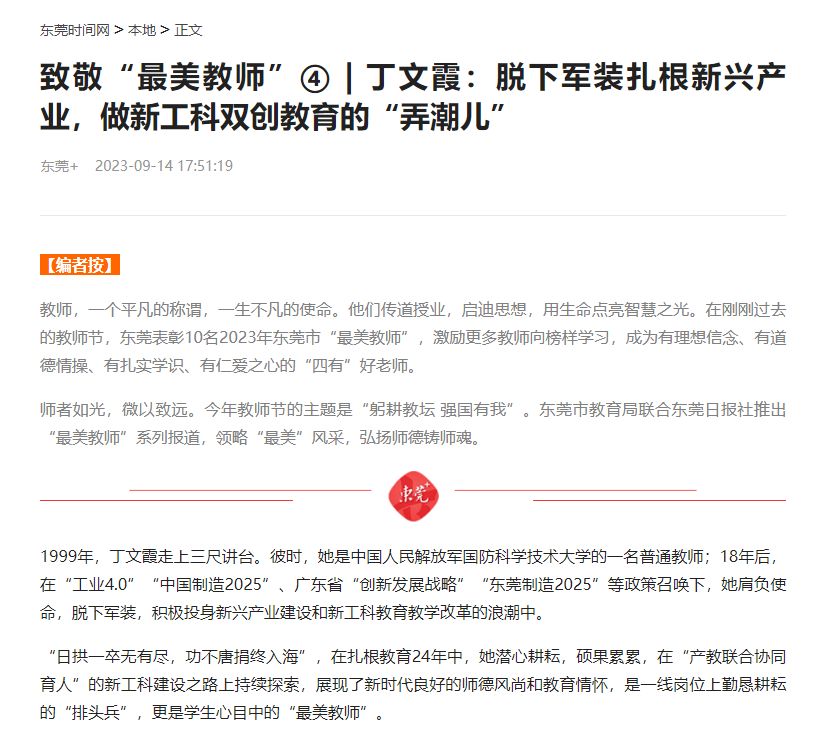 1999年,丁文霞走上三尺讲台。彼时,她是中国人民解放军国防科学技术大学的一名普通教师;18年后,在“工业4.0”“中国制造2025”、广东省“创新发展战略”“东莞制造2025”等政策召唤下,她肩负使命,脱下军装,积极投身新兴产业建设和新工科教育教学改革的浪潮中。