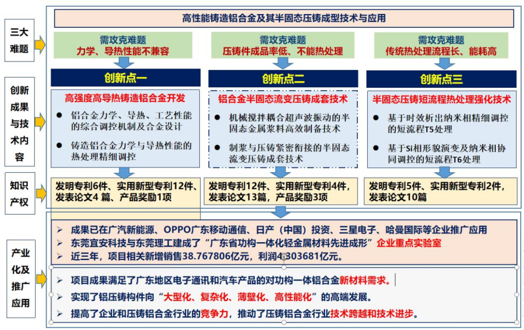 “高性能铸造铝合金及其半固态压铸成型技术与应用”项目针对压铸行业存在的铝合金力学/导热性能不兼容、复杂薄壁压铸件成品率低、传统热处理流程长能耗高三大难题,解决了制约高性能低成本铝合金压铸件的技术难题。已在广汽新能源、OPPO等40余家省内外企业获得推广应用,取得了良好的经济社会效益,不仅满足了广东地区电子通讯和汽车产品的对功构一体铝合金新材料需求,实现了铝压铸构件向“复杂化、薄壁化、高性能化”的高端发展,也推动了压铸铝合金行业技术跨越和技术进步。