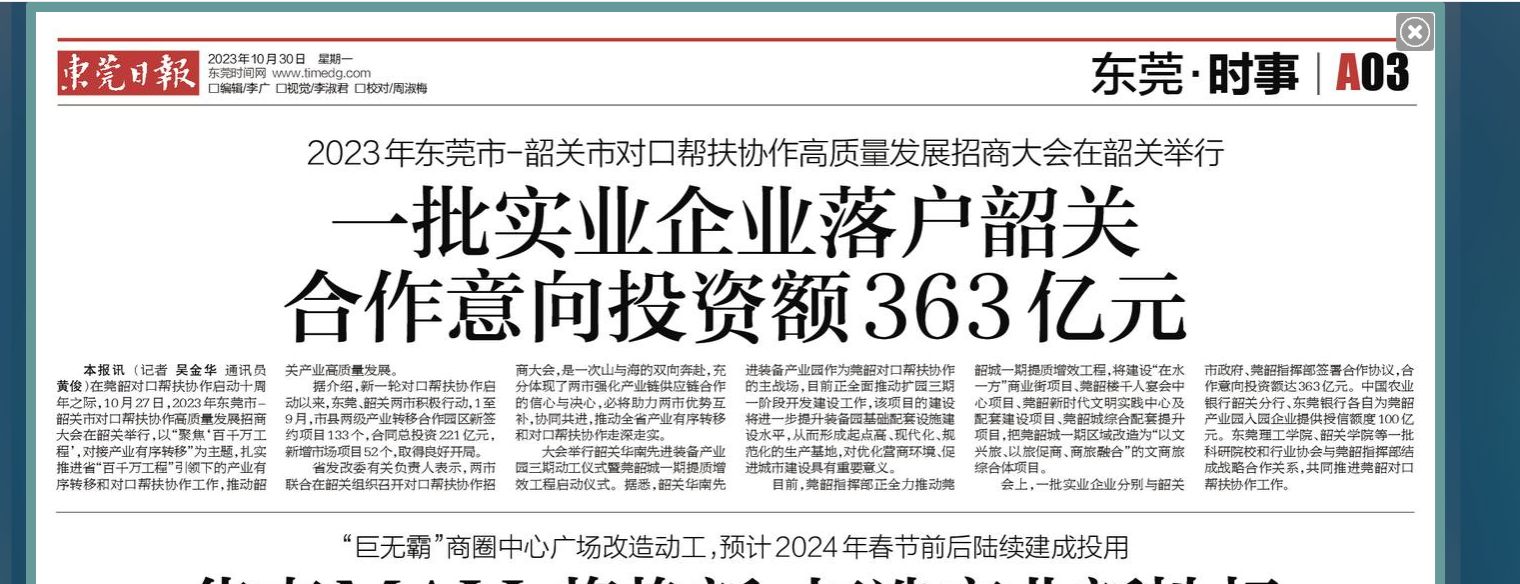 在莞韶对口帮扶协作启动十周年之际,10月27日,2023年东莞市-韶关市对口帮扶协作高质量发展招商大会在韶关举行,以“聚焦‘百千万工程’,对接产业有序转移”为主题,扎实推进省“百千万工程”引领下的产业有序转移和对口帮扶协作工作,推动韶关产业高质量发展。