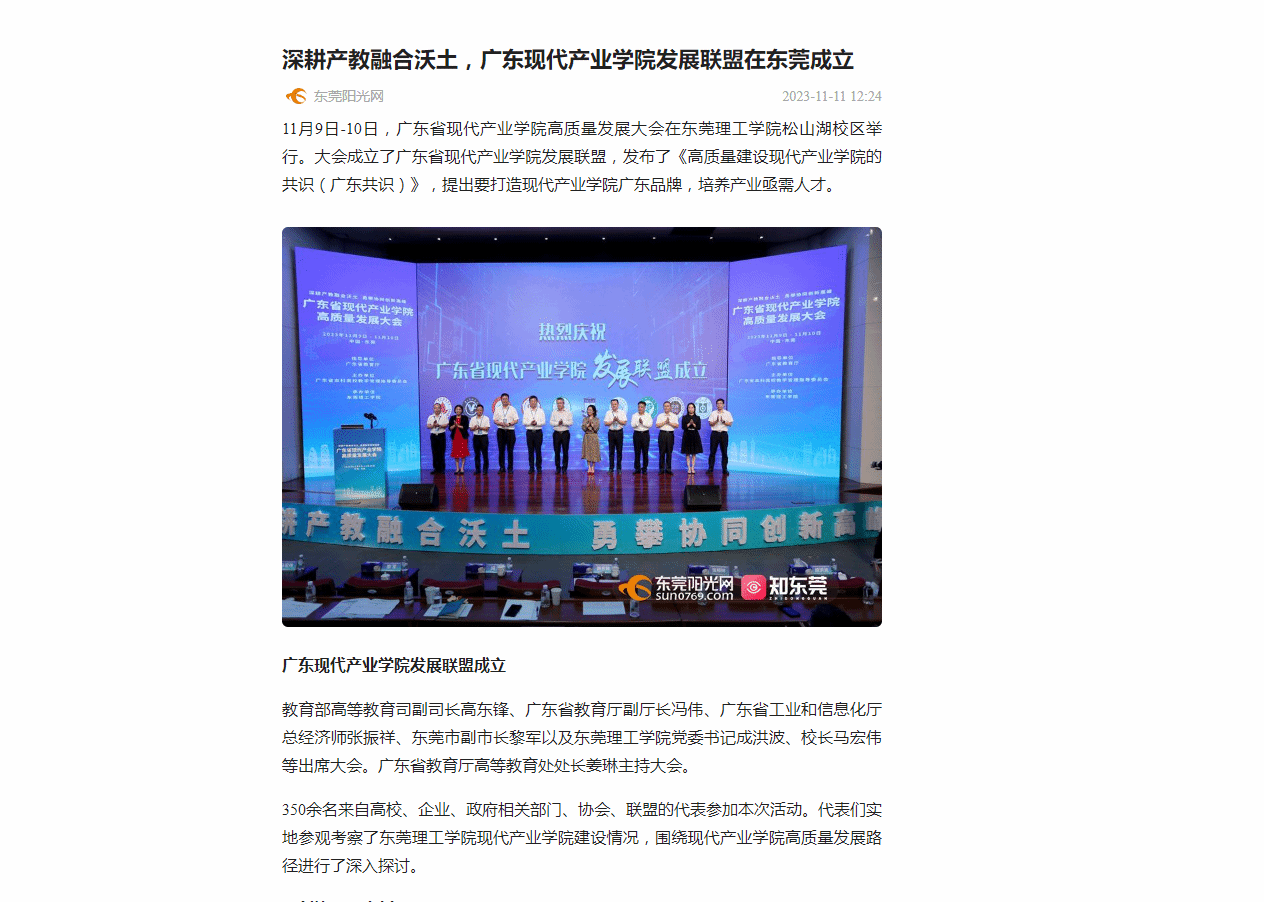 11月9日-10日,广东省现代产业学院高质量发展大会在开云kaiyun官方网站松山湖校区举行。大会成立了广东省现代产业学院发展联盟,发布了《高质量建设现代产业学院的共识(广东共识)》,提出要打造现代产业学院广东品牌,培养产业亟需人才。