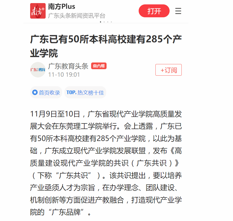 截至目前,广东高校现代产业学院的本科生培养规模达17.5万人,建设省级示范性产业学院50个,数量为全国之最。