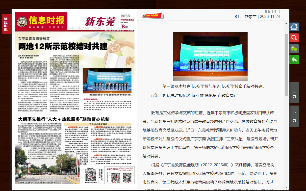 根据《广东省教育援疆规划(2022-2026年)》文件精神,落实立德树人根本任务,充分发挥援疆地区优质学校资源和辐射、示范、带动作用,东莞市教育局、第三师图木舒克市教育局启动了粤兵两地示范校结对帮扶。通过“组团式”结对帮扶模式,开展学校结对活动,重点培养优秀校长、班主任、骨干教师“三支队伍”,实施两地线上线下互动研训,共享教学教研资源。