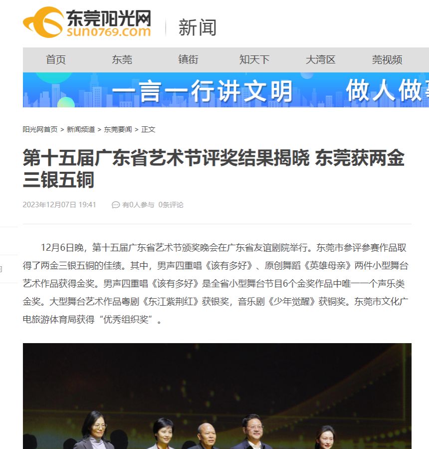 12月6日晚,第十五届广东省艺术节颁奖晚会在广东省友谊剧院举行。东莞市参评参赛作品取得了两金三银五铜的佳绩。其中,男声四重唱《该有多好》、原创舞蹈《英雄母亲》两件小型舞台艺术作品获得金奖。男声四重唱《该有多好》是全省小型舞台节目6个金奖作品中唯一一个声乐类金奖。大型舞台艺术作品粤剧《东江紫荆红》获银奖,音乐剧《少年觉醒》获铜奖。东莞市文化广电旅游体育局获得“优秀组织奖”。