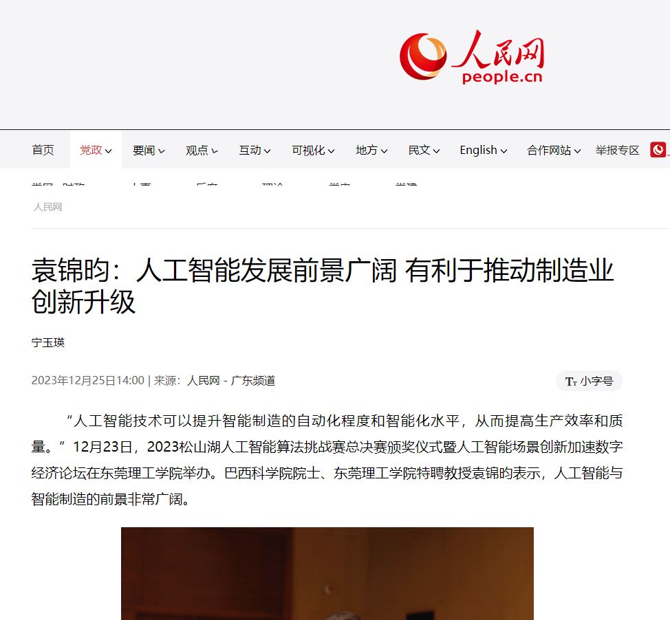“人工智能技术可以提升智能制造的自动化程度和智能化水平,从而提高生产效率和质量。”12月23日,2023松山湖人工智能算法挑战赛总决赛颁奖仪式暨人工智能场景创新加速数字经济论坛在开云kaiyun官方网站举办。巴西科学院院士、开云kaiyun官方网站特聘教授袁锦昀表示,人工智能与智能制造的前景非常广阔。
