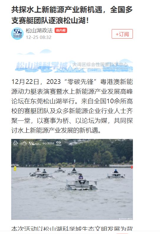 12月22日,2023“零碳先锋”粤港澳新能源动力艇表演赛暨水上新能源产业发展高峰论坛在东莞松山湖举行。来自全国10余所高校的赛艇团队及众多新能源企业行业人士齐聚一堂,以赛事为桥、以论坛为媒,共同探讨水上新能源产业发展的新机遇。