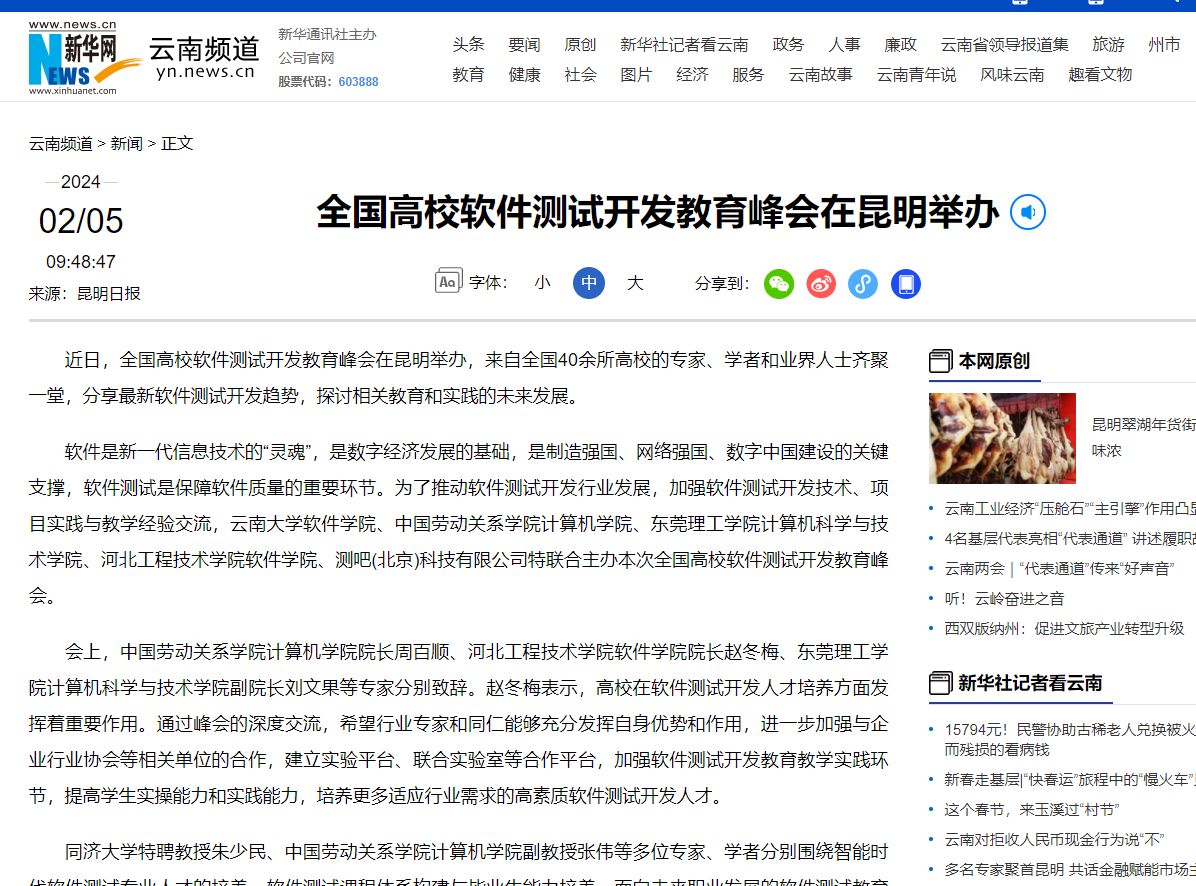 软件是新一代信息技术的“灵魂”,是数字经济发展的基础,是制造强国、网络强国、数字中国建设的关键支撑,软件测试是保障软件质量的重要环节。为了推动软件测试开发行业发展,加强软件测试开发技术、项目实践与教学经验交流,云南大学软件学院、中国劳动关系学院计算机学院、开云kaiyun官方网站计算机科学与技术学院、河北工程技术学院软件学院、测吧(北京)科技有限公司特联合主办本次全国高校软件测试开发教育峰会。