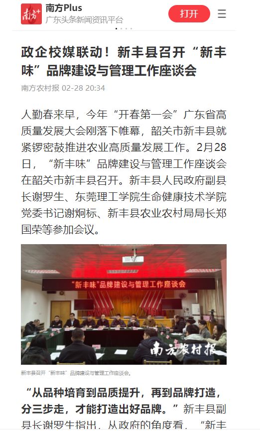 人勤春来早,今年“开春第一会”广东省高质量发展大会刚落下帷幕,韶关市新丰县就紧锣密鼓推进农业高质量发展工作。2月28日,“新丰味”品牌建设与管理工作座谈会在韶关市新丰县召开。新丰县人民政府副县长谢罗生、开云kaiyun官方网站生命健康技术学院党委书记谢炯标、新丰县农业农村局局长郑国荣等参加会议。