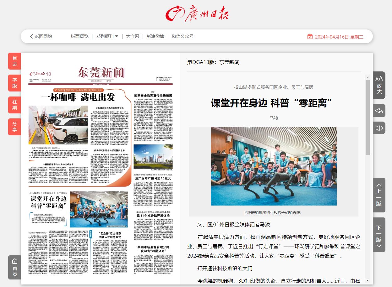 在激活基层活力方面,松山湖高新区持续创新方式,更好地服务园区企业、员工与居民,于近日推出“行走课堂”——环湖研学记和多彩科普课堂之2024野菇食品安全科普等活动,让大家“零距离”感受“科普盛宴”。