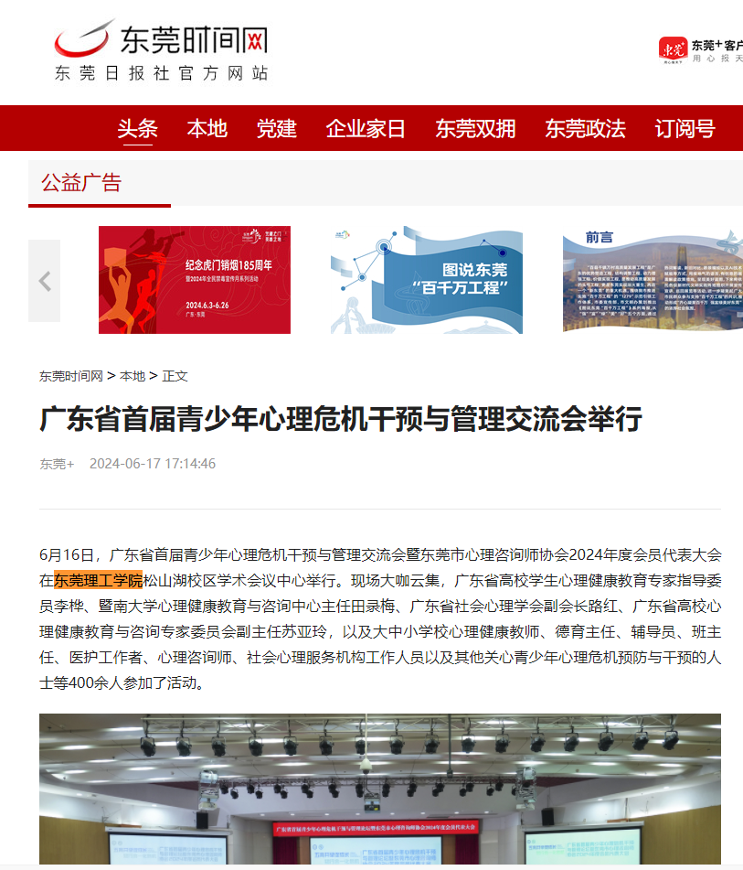 6月16日,广东省首届青少年心理危机干预与管理交流会暨东莞市心理咨询师协会2024年度会员代表大会在开云kaiyun官方网站松山湖校区学术会议中心举行。现场大咖云集,广东省高校学生心理健康教育专家指导委员李桦、暨南大学心理健康教育与咨询中心主任田录梅、广东省社会心理学会副会长路红、广东省高校心理健康教育与咨询专家委员会副主任苏亚玲,以及大中小学校心理健康教师、德育主任、辅导员、班主任、医护工作者、心理咨询师、社会心理服务机构工作人员以及其他关心青少年心理危机预防与干预的人士等400余人参加了活动。