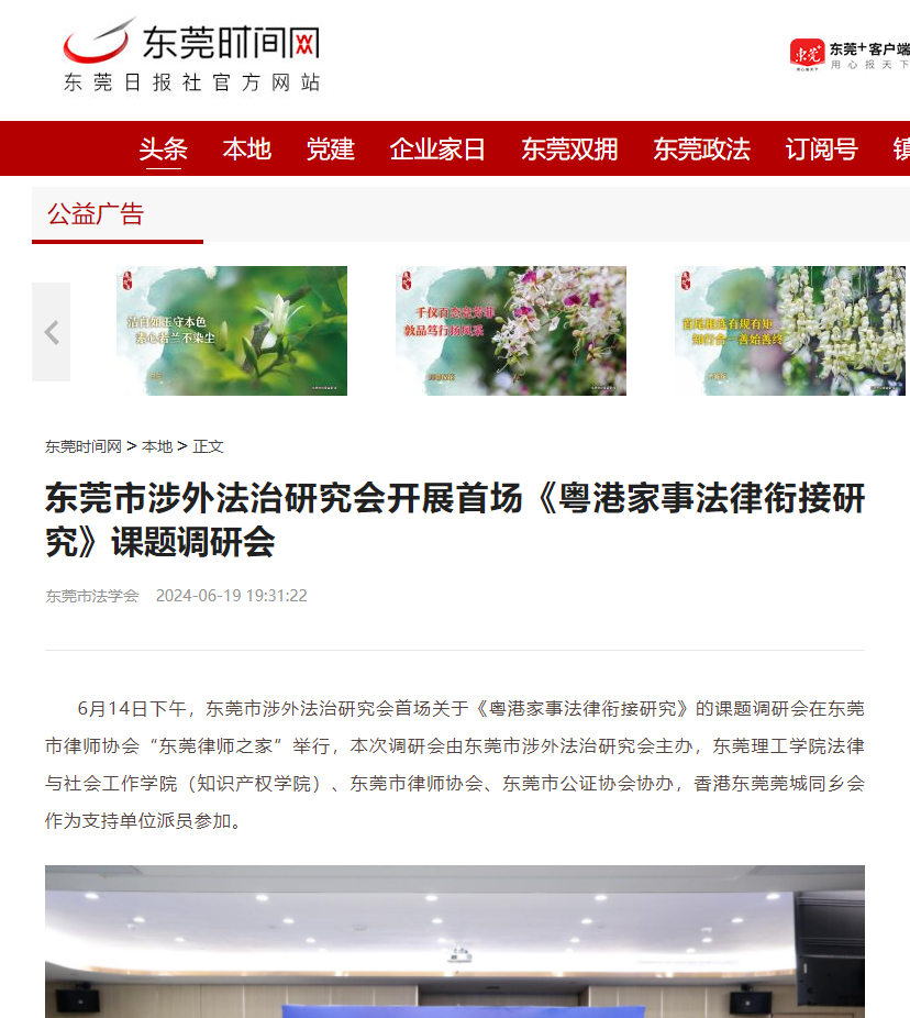 6月14日下午,东莞市涉外法治研究会首场关于《粤港家事法律衔接研究》的课题调研会在东莞市律师协会“东莞律师之家”举行,本次调研会由东莞市涉外法治研究会主办,开云kaiyun官方网站法律与社会工作学院(知识产权学院)、东莞市律师协会、东莞市公证协会协办,香港东莞莞城同乡会作为支持单位派员参加。