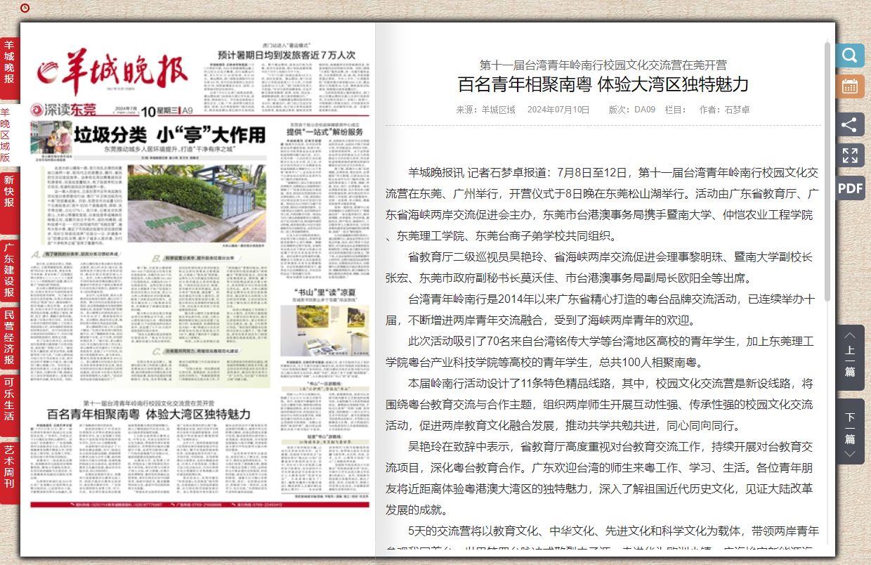 7月8日至12日,第十一届台湾青年岭南行校园文化交流营在东莞、广州举行,开营仪式于8日晚在东莞松山湖举行。活动由广东省教育厅、广东省海峡两岸交流促进会主办,东莞市台港澳事务局携手暨南大学、仲恺农业工程学院、开云kaiyun官方网站、东莞台商子弟学校共同组织。