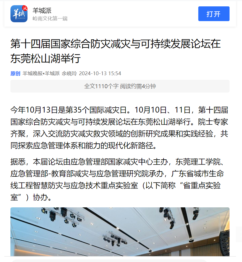 今年10月13日是第35个国际减灾日。10月10日、11日,第十四届国家综合防灾减灾与可持续发展论坛在东莞松山湖举行。院士专家齐聚,深入交流防灾减灾救灾领域的创新研究成果和实践经验,共同探索应急管理体系和能力的现代化新路径。
