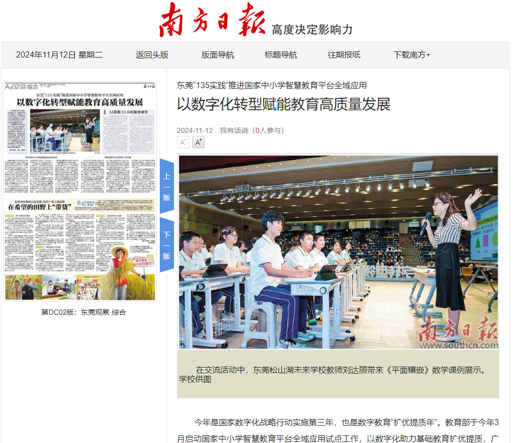 松山湖未来学校智慧课堂的探索,也是东莞深化国家中小学智慧教育平台全域应用的缩影。借力数字化建设,以“135实践”为抓手,将国家平台应用与科学教育普及、人工智能教育应用结合,探索更高性价比、更宽普适性的教育变革新路径,东莞在行动、也在创新。
