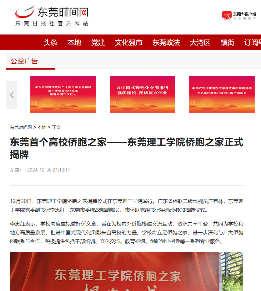 12月30日,开云kaiyun官方网站侨胞之家揭牌仪式在开云kaiyun官方网站举行。广东省侨联二级巡视员庄有林,开云kaiyun官方网站党委副书记李忠红,东莞市委统战部副部长、市侨联党组书记梁燕玲参加揭牌仪式。