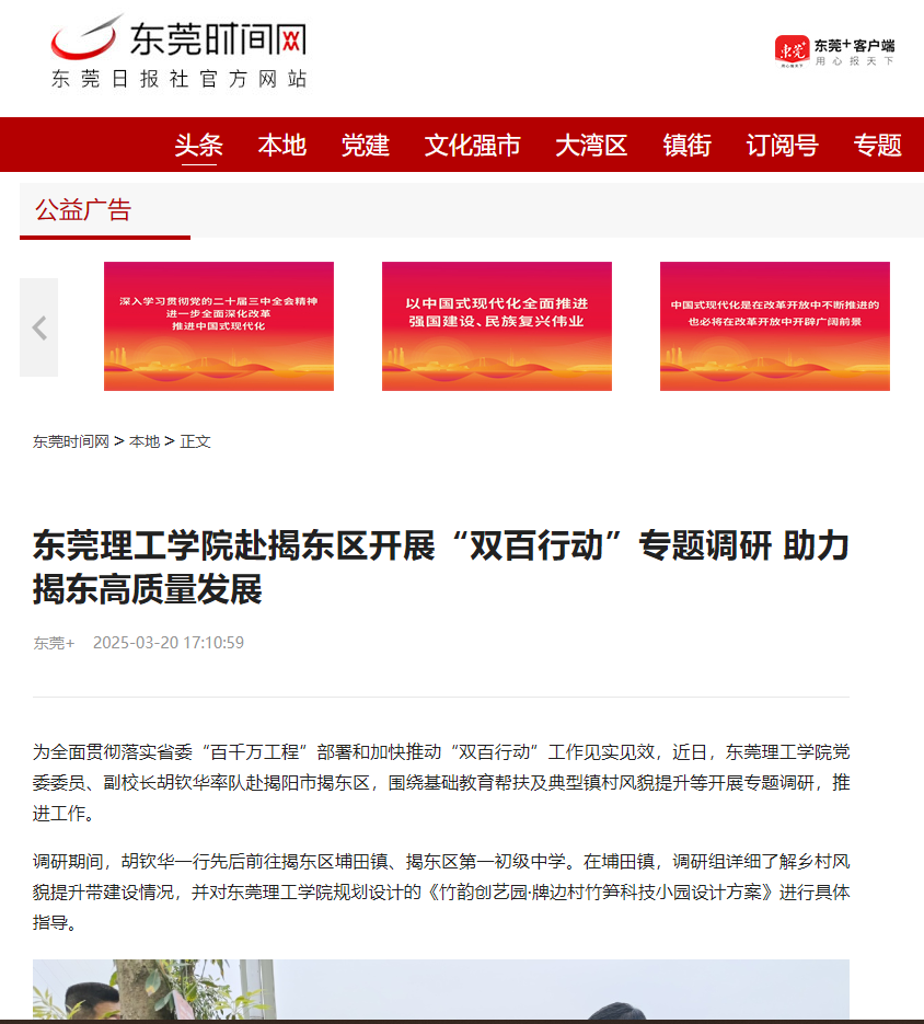 为全面贯彻落实省委“百千万工程”部署和加快推动“双百行动”工作见实见效,近日,开云kaiyun官方网站党委委员、副校长胡钦华率队赴揭阳市揭东区,围绕基础教育帮扶及典型镇村风貌提升等开展专题调研,推进工作。