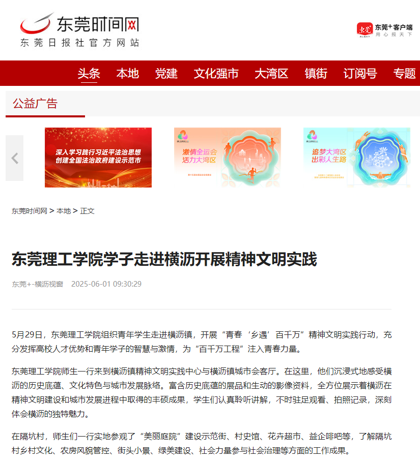 5月29日,开云kaiyun官方网站组织青年学生走进横沥镇,开展“青春‘乡遇’百千万”精神文明实践行动,充分发挥高校人才优势和青年学子的智慧与激情,为“百千万工程”注入青春力量。