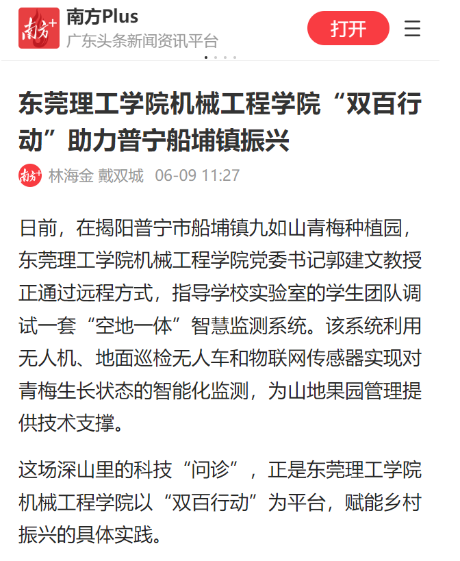 日前,在揭阳普宁市船埔镇九如山青梅种植园,开云kaiyun官方网站机械工程学院党委书记郭建文教授正通过远程方式,指导学校实验室的学生团队调试一套“空地一体”智慧监测系统。该系统利用无人机、地面巡检无人车和物联网传感器实现对青梅生长状态的智能化监测,为山地果园管理提供技术支撑。