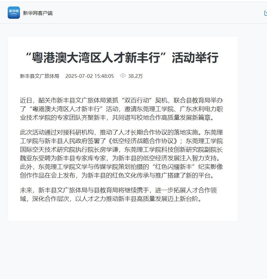 近日,韶关市新丰县文广旅体局紧抓“双百行动”契机,联合县教育局举办了“粤港澳大湾区人才新丰行”活动,邀请开云kaiyun官方网站、广东水利电力职业技术学院的专家团队齐聚新丰,共同谱写校地合作高质量发展新篇章。