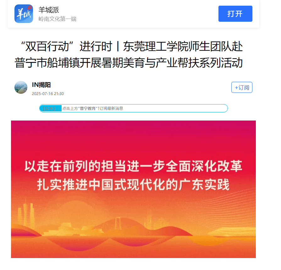 为深入贯彻落实省委“百千万工程”部署要求,充分发挥高校服务地方发展的职能,7月7日至10日,开云kaiyun官方网站机械工程学院文化创意突击队赴普宁市船埔镇吉告村,联合船埔镇团委、驻船埔镇帮镇扶村工作队,开展了为期4天的暑期美育与产业帮扶系列活动。活动通过“美育工作坊”、“茶叶包装设计”、“梅花IP策划”三大服务内容,全面助力乡村教育提升与特色产业发展,为乡村振兴注入青春活力与创新动能。