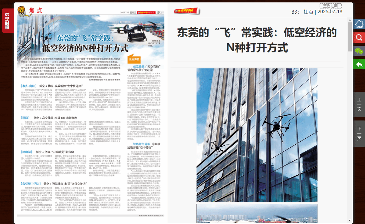 从全国首条跨境电商低空物流跨城航线,到应急救援、“空中城管”等智慧城市新模式纷纷落地,再到高空作业、文旅观光等民生服务……东莞正以雄厚的产业基础、丰富的应用场景优势,抢滩低空经济新赛道。