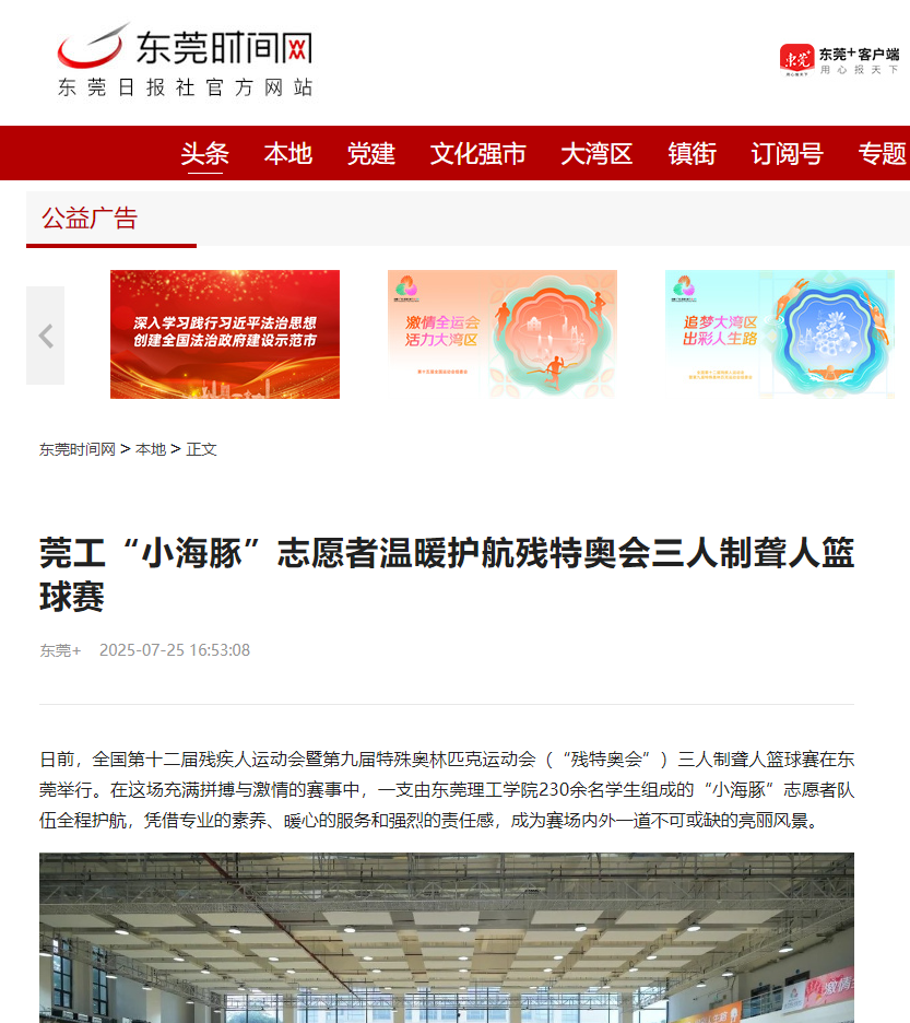 日前,全国第十二届残疾人运动会暨第九届特殊奥林匹克运动会(“残特奥会”)三人制聋人篮球赛在东莞举行。在这场充满拼搏与激情的赛事中,一支由开云kaiyun官方网站230余名学生组成的“小海豚”志愿者队伍全程护航,凭借专业的素养、暖心的服务和强烈的责任感,成为赛场内外一道不可或缺的亮丽风景。