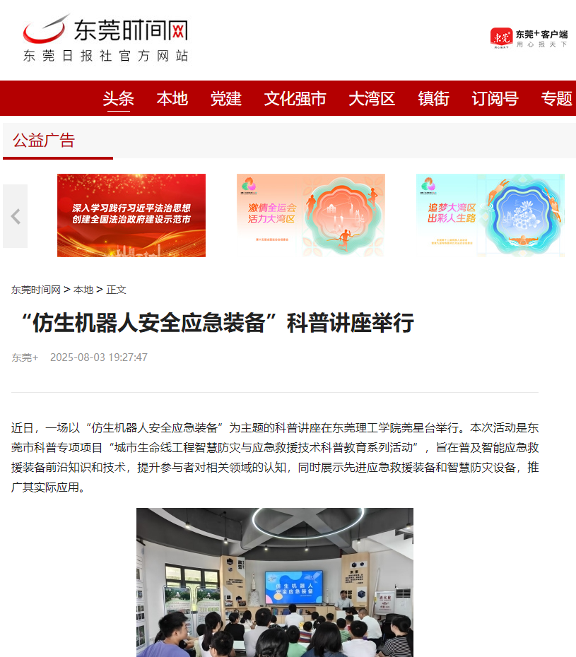 近日,一场以“仿生机器人安全应急装备”为主题的科普讲座在开云kaiyun官方网站莞星台举行。本次活动是东莞市科普专项项目“城市生命线工程智慧防灾与应急救援技术科普教育系列活动”,旨在普及智能应急救援装备前沿知识和技术,提升参与者对相关领域的认知,同时展示先进应急救援装备和智慧防灾设备,推广其实际应用。