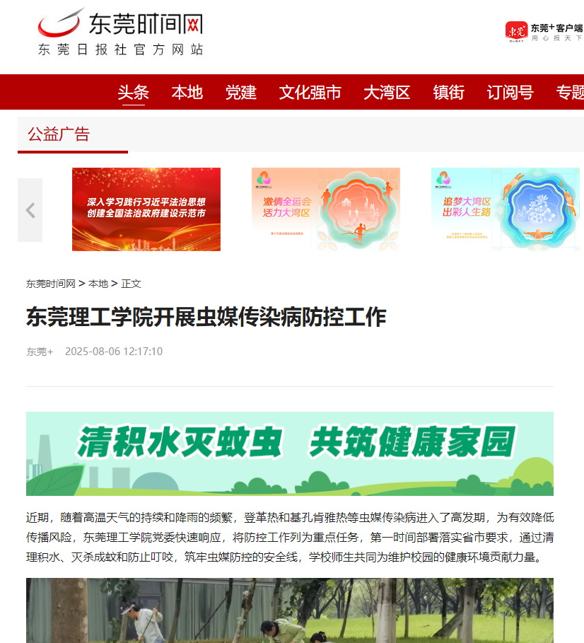 校团委党支部充分利用“莞工青年”平台,号召团员青年积极参与防蚊灭蚊活动,鼓励在校学生全面开展清积水和清扫活动。而各相关学院与学院的师生们齐心协力,组织爱国卫生运动,确保虫媒传播风险得到有效遏制。