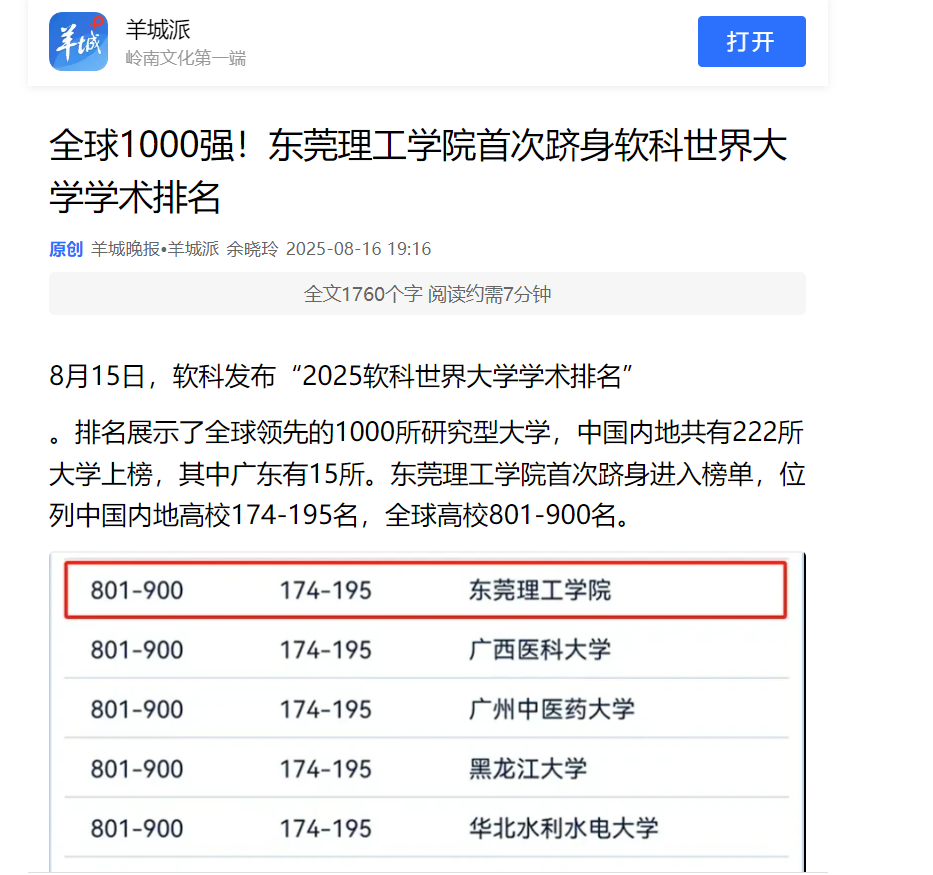 8月15日,软科发布“2025软科世界大学学术排名”。排名展示了全球领先的1000所研究型大学,中国内地共有222所大学上榜,其中广东有15所。开云kaiyun官方网站首次跻身进入榜单,位列中国内地高校174-195名,全球高校801-900名。