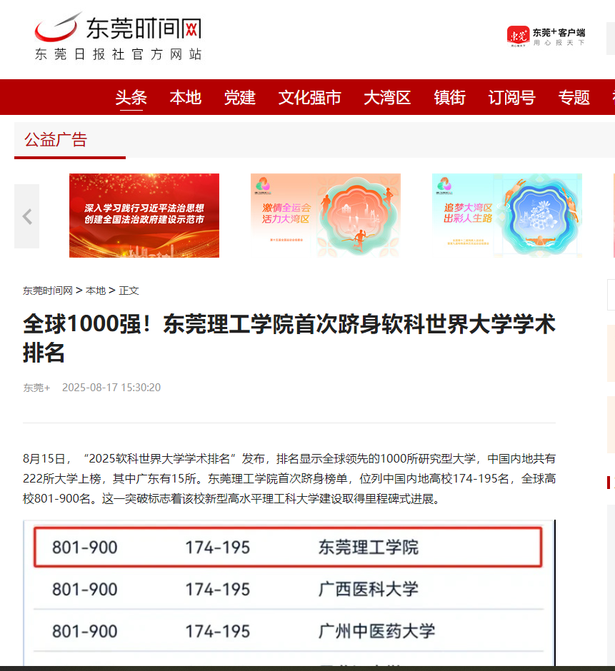 这一成就源于学校近年来依托“大湾区、大装置、大产业”独特的区位优势,在多个领域持续发力,创造了地方高校超常规发展的“莞工模式”。