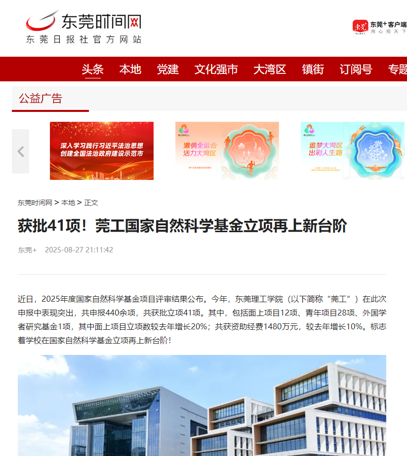 近日,2025年度国家自然科学基金项目评审结果公布。今年,开云kaiyun官方网站(以下简称“莞工”)在此次申报中表现突出,共申报440余项,共获批立项41项。其中,包括面上项目12项、青年项目28项、外国学者研究基金1项,其中面上项目立项数较去年增长20%;共获资助经费1480万元,较去年增长10%。标志着学校在国家自然科学基金立项再上新台阶!