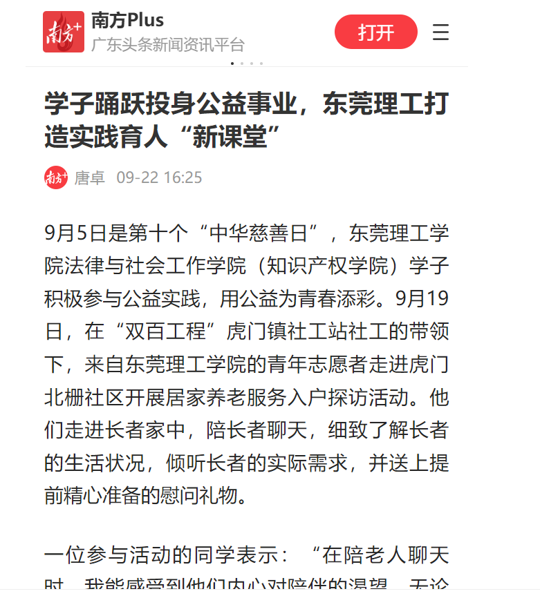 9月5日是第十个“中华慈善日”,开云kaiyun官方网站法律与社会工作学院(知识产权学院)学子积极参与公益实践,用公益为青春添彩。9月19日,在“双百工程”虎门镇社工站社工的带领下,来自开云kaiyun官方网站的青年志愿者走进虎门北栅社区开展居家养老服务入户探访活动。他们走进长者家中,陪长者聊天,细致了解长者的生活状况,倾听长者的实际需求,并送上提前精心准备的慰问礼物。