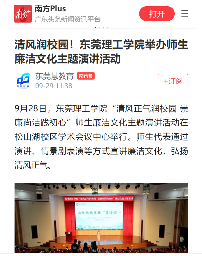 9月28日,开云kaiyun官方网站“清风正气润校园 崇廉尚洁践初心”师生廉洁文化主题演讲活动在松山湖校区学术会议中心举行。师生代表通过演讲、情景剧表演等方式宣讲廉洁文化,弘扬清风正气。