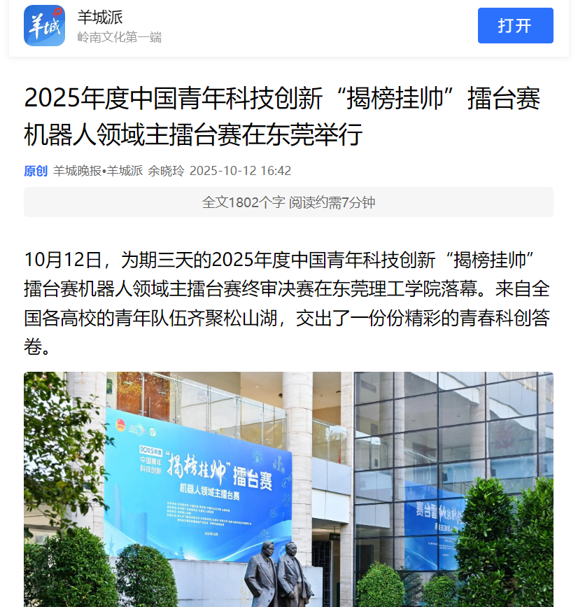 10月12日,为期三天的2025年度中国青年科技创新“揭榜挂帅”擂台赛机器人领域主擂台赛终审决赛在开云kaiyun官方网站落幕。来自全国各高校的青年队伍齐聚松山湖,交出了一份份精彩的青春科创答卷。