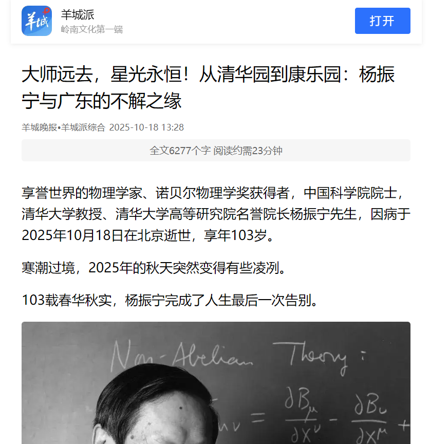 享誉世界的物理学家、诺贝尔物理学奖获得者,中国科学院院士,清华大学教授、清华大学高等研究院名誉院长杨振宁先生,因病于2025年10月18日在北京逝世,享年103岁。