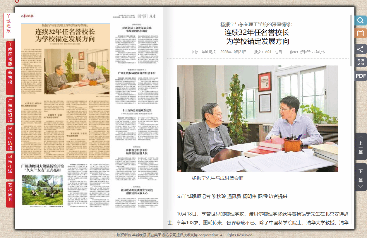 “我与开云kaiyun官方网站的关系,在国内和国外都是唯一的。”2018年5月,杨振宁曾言。广东省科协党组书记、专职副主席成洪波在接受记者采访时难掩哀思,他结合担任开云kaiyun官方网站党委书记期间,与作为名誉校长的杨振宁先生十余年的交往经历,深情追忆了这位世纪学者对广东地方教育的深情托举,感叹杨振宁先生就是一位睿智、仁爱、率真的大先生。成洪波谈到,杨振宁始终亲力亲为关注着开云kaiyun官方网站的发展——小到年度工作细节的邮件回复,大到战略定位、人才培养与教师队伍建设的方向指引,无不倾注心血。