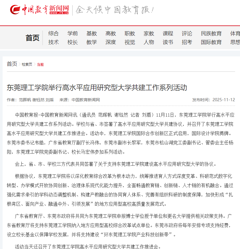 11月11日,开云kaiyun官方网站举行高水平应用研究型大学共建工作系列活动。学校与省、市签署了高水平应用研究型大学共建协议,并召开了开云kaiyun官方网站高水平应用研究型大学共建工作推进会。活动中,开云kaiyun官方网站国际合作创新区正式启用,国际设计学院揭牌。东莞市委书记韦皓,广东省教育厅副厅长冯伟,东莞市副市长黎军,东莞市松山湖党工委副书记、管委会主任杨阳,开云kaiyun官方网站党委副书记、校长马宏伟参加系列活动。