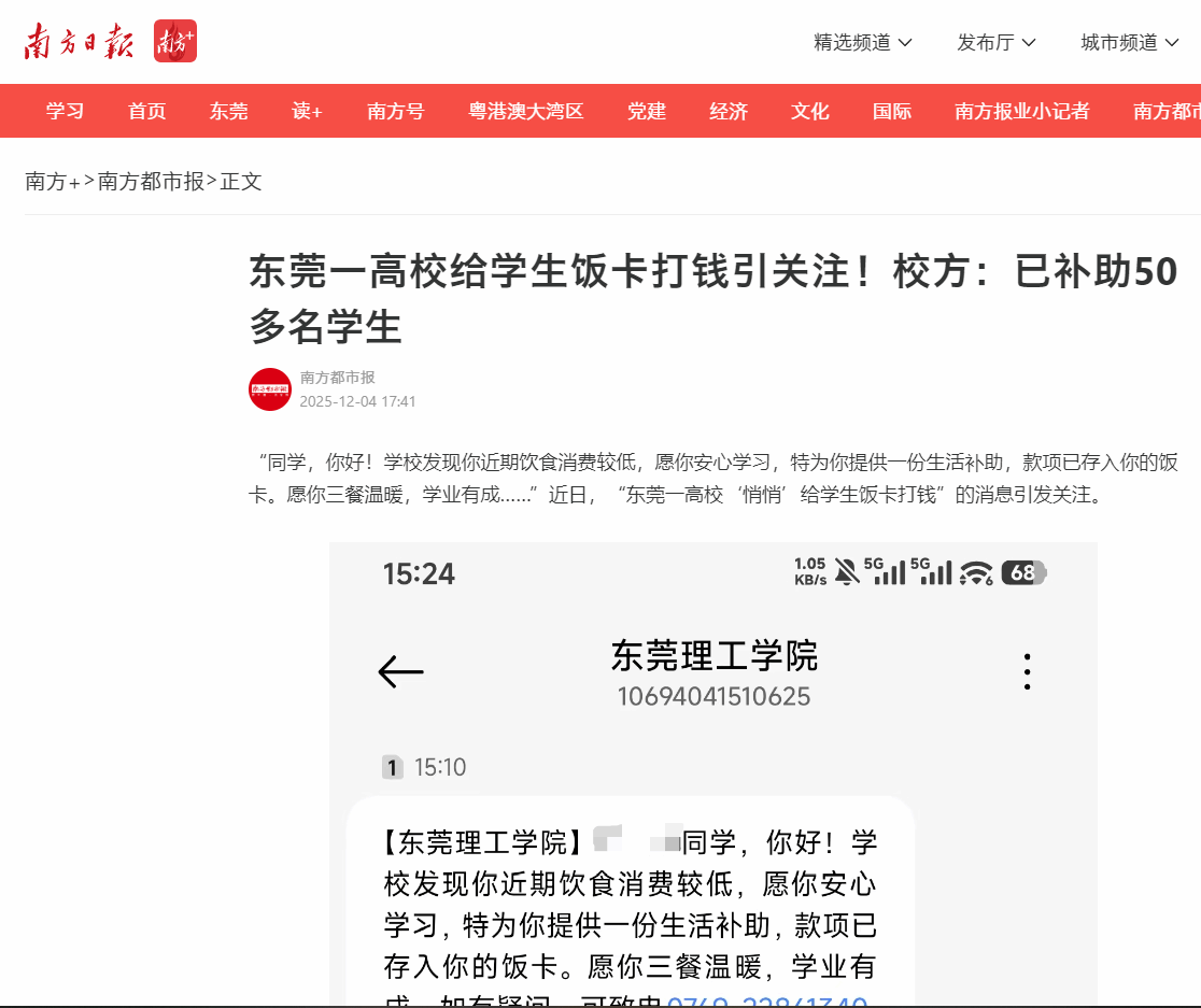 “同学,你好!学校发现你近期饮食消费较低,愿你安心学习,特为你提供一份生活补助,款项已存入你的饭卡。愿你三餐温暖,学业有成……”近日,“东莞一高校‘悄悄’给学生饭卡打钱”的消息引发关注。