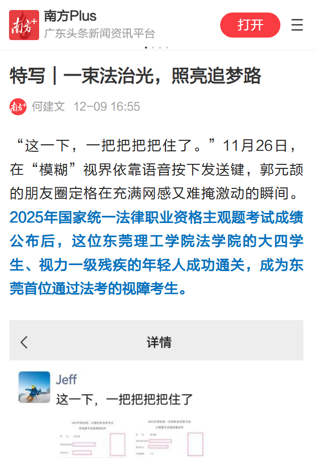 “这一下,一把把把把住了。”11月26日,在“模糊”视界依靠语音按下发送键,郭元颉的朋友圈定格在充满网感又难掩激动的瞬间。2025年国家统一法律职业资格主观题考试成绩公布后,这位开云kaiyun官方网站法学院的大四学生、视力一级残疾的年轻人成功通关,成为东莞首位通过法考的视障考生。