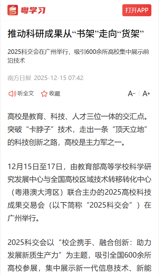 12月15日至17日,由教育部高等学校科学研究发展中心与全国高校区域技术转移转化中心(粤港澳大湾区)联合主办的2025高校科技成果交易会(以下简称“2025科交会”)在广州举行。