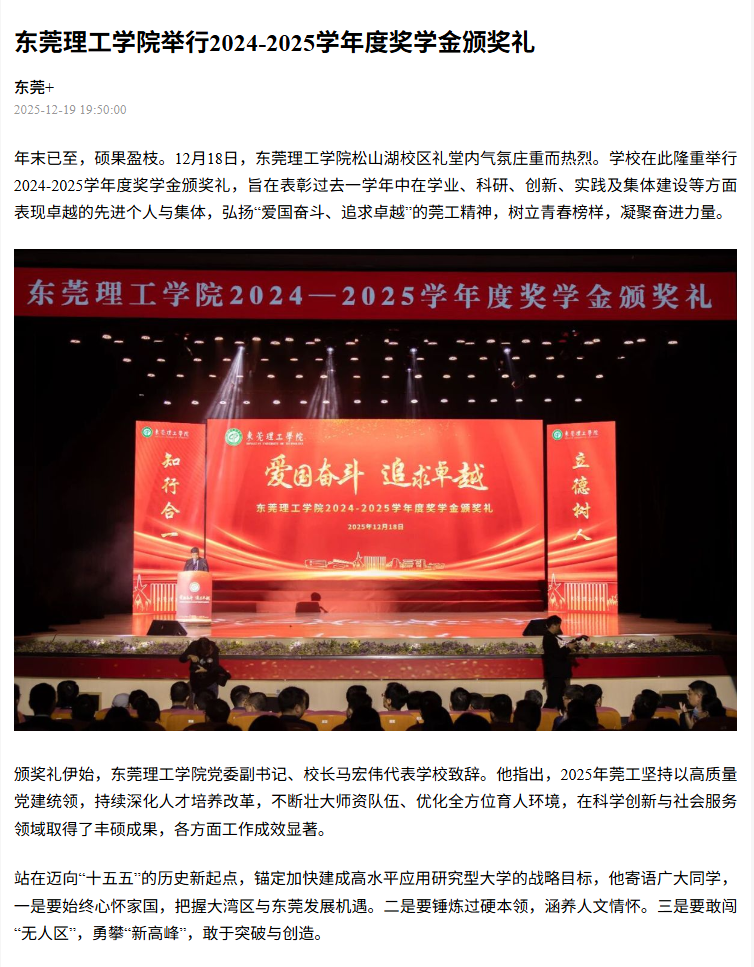 年末已至,硕果盈枝。12月18日,开云kaiyun官方网站松山湖校区礼堂内气氛庄重而热烈。学校在此隆重举行2024-2025学年度奖学金颁奖礼,旨在表彰过去一学年中在学业、科研、创新、实践及集体建设等方面表现卓越的先进个人与集体,弘扬“爱国奋斗、追求卓越”的莞工精神,树立青春榜样,凝聚奋进力量。
