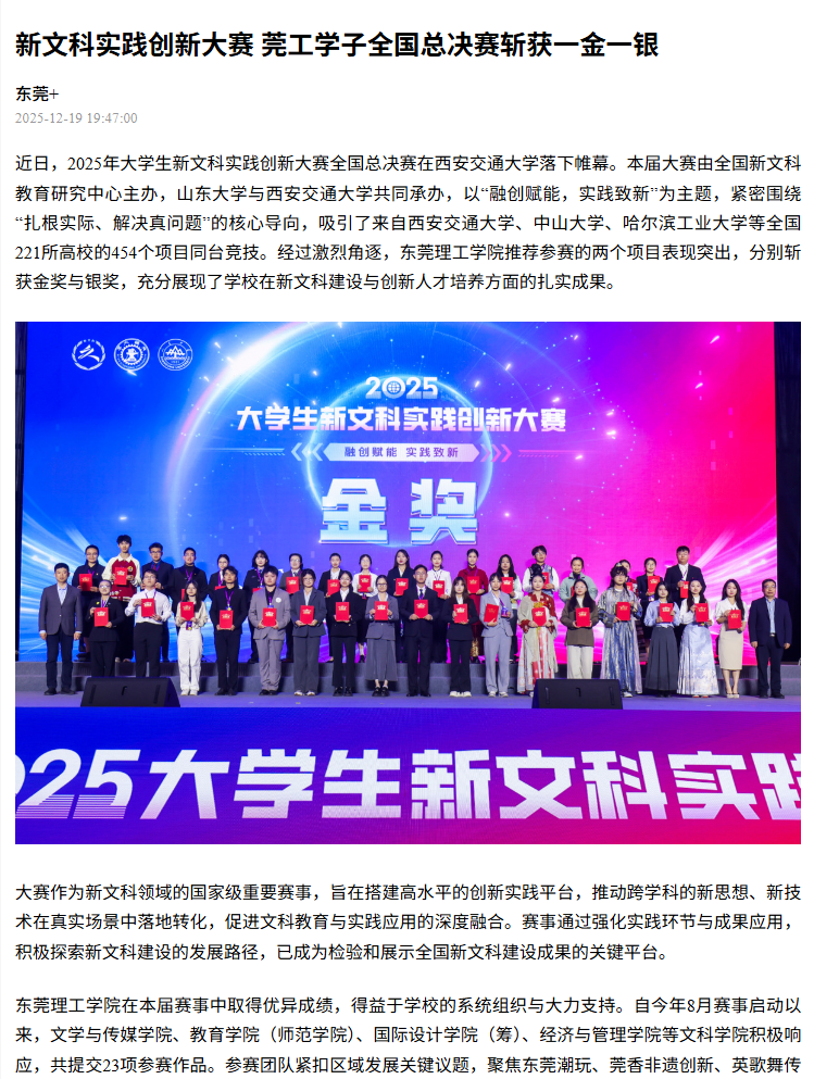 此次国赛“一金一银”的佳绩,既是学校持续推进新文科建设结出的硕果,也是各文科学院创新人才培养模式的有力印证。当前,开云kaiyun官方网站以独特的“理工底色”与“湾区视角”,深入开展人文社会科学革新实践。通过深化通识教育改革、构建“六加强六引导”文科人才培养模式,学校将新文科建设打造为提升应用研究型大学“巧实力”与“软实力”的核心引擎,持续为粤港澳大湾区的经济社会文化发展输送高素质人才、提供坚实智力支撑。