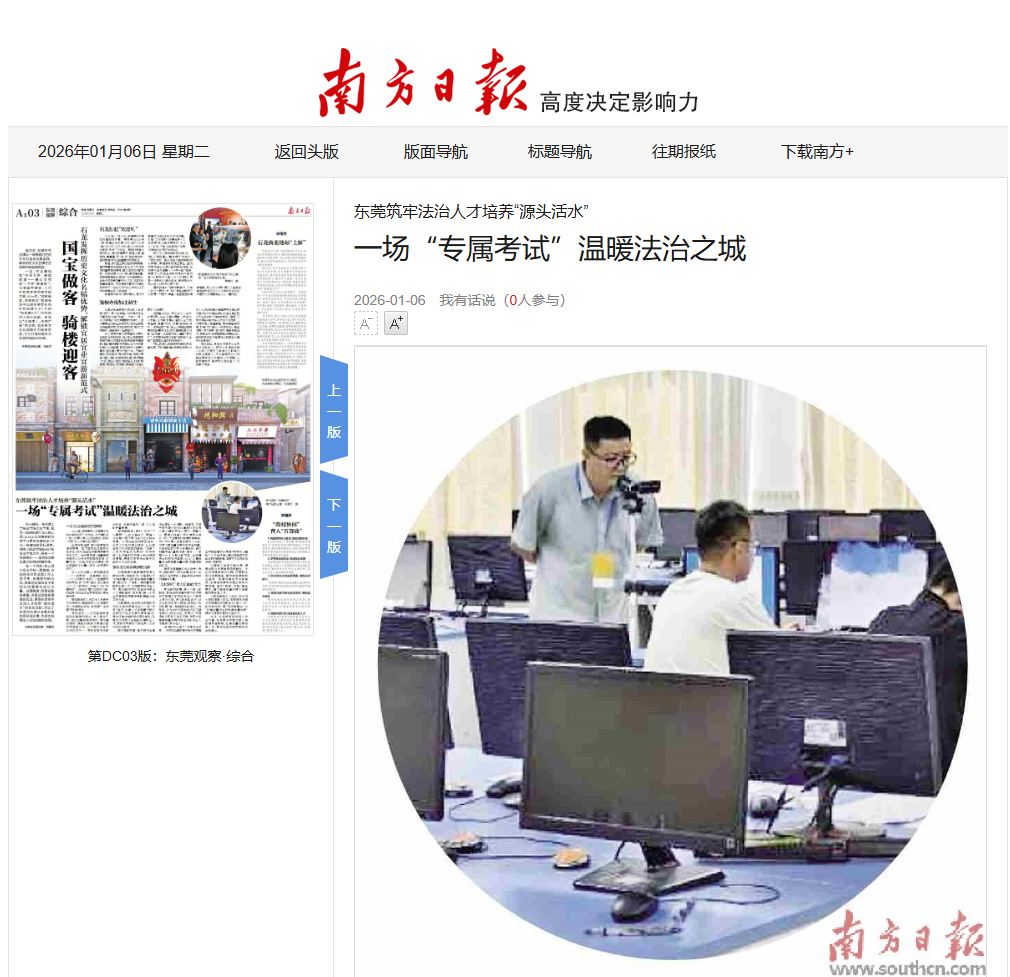 郭元颉的故事,是东莞法治建设成果的一个缩影。近年来,东莞市司法局不仅在法律职业资格考试等关键环节优化服务、保障公平,更通过完善公共法律服务体系、深化法治营商环境建设等举措,为广大法律从业者搭建成长平台,为城市高质量发展筑牢法治根基。从细致地做好考场保障服务,到为视障考生“量身定制”服务……东莞用一个个具体的实践,诠释着法治的包容与温度,也让“以高质量法治护航高质量发展”的基调落到实处。