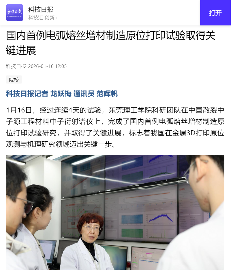该试验成果将为大尺寸、高性能复杂构件的精准制造提供核心技术支撑,同时为我国增材制造技术从“经验优化”向“科学设计”转型奠定重要基础。未来,张丽娟教授团队将继续深化与散裂中子源工程材料谱仪的合作,拓展原位表征在多材料增材制造、极端环境适配等方向的应用。