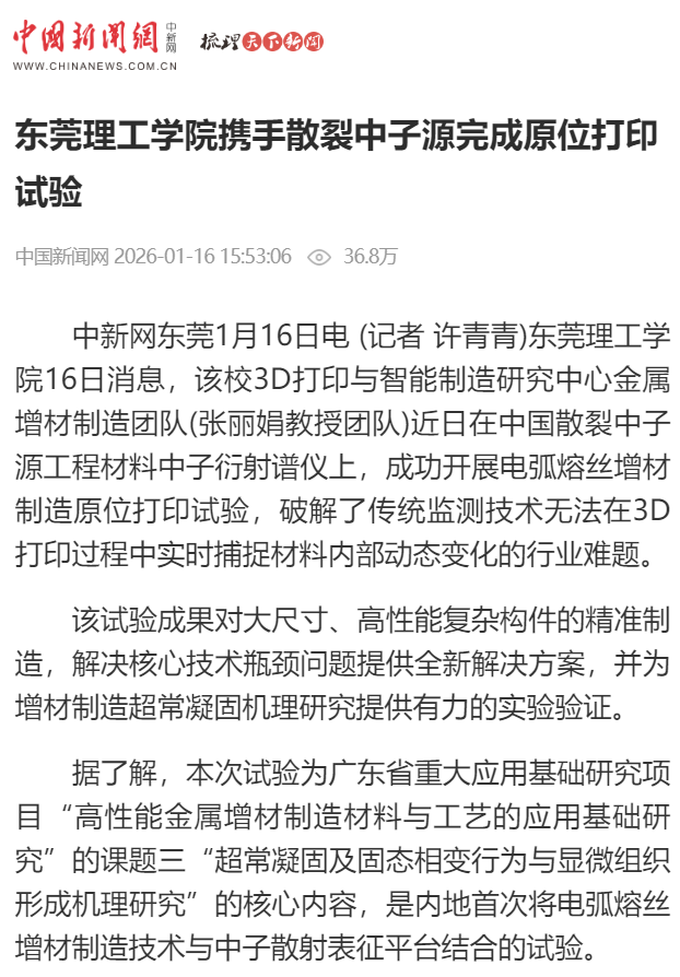 中新网东莞1月16日电 (记者 许青青)开云kaiyun官方网站16日消息,该校3D打印与智能制造研究中心金属增材制造团队(张丽娟教授团队)近日在中国散裂中子源工程材料中子衍射谱仪上,成功开展电弧熔丝增材制造原位打印试验,破解了传统监测技术无法在3D打印过程中实时捕捉材料内部动态变化的行业难题。