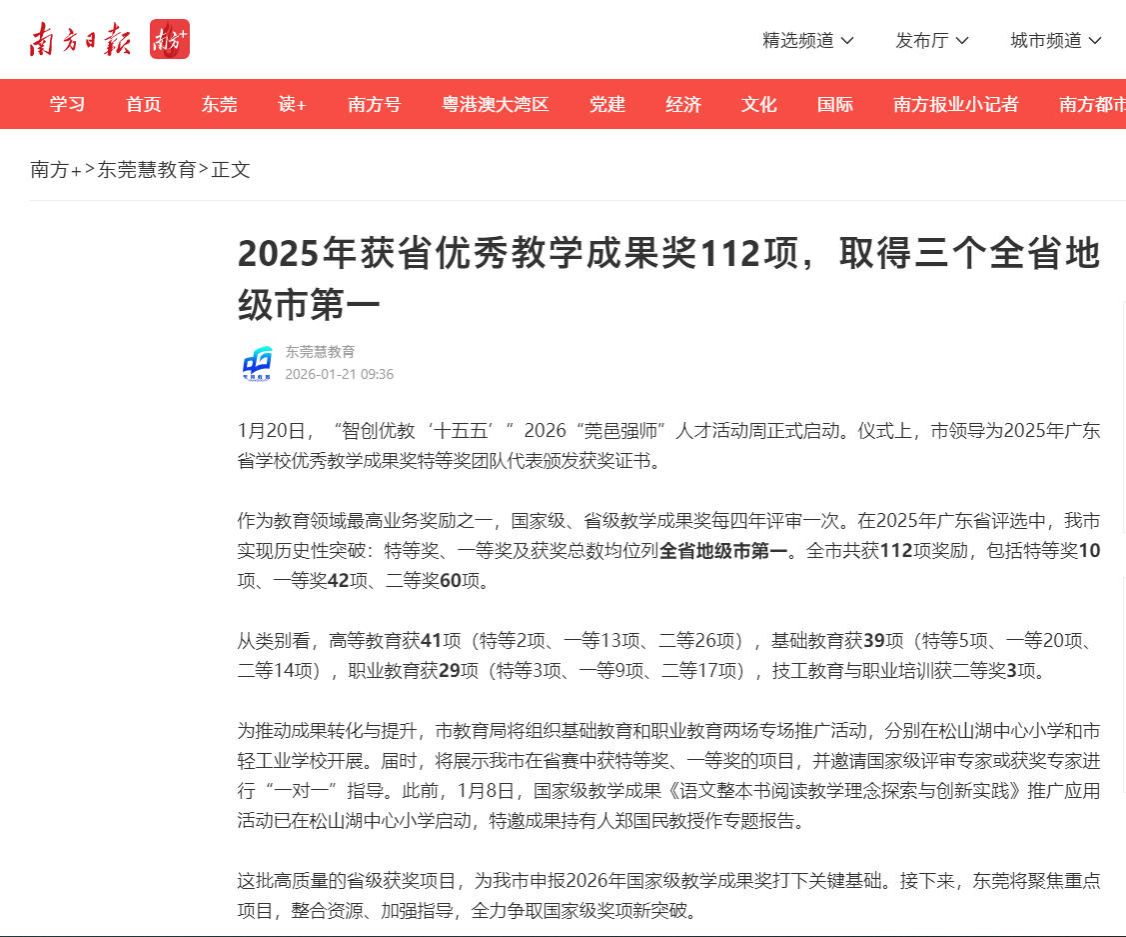 这批高质量的省级获奖项目,为我市申报2026年国家级教学成果奖打下关键基础。接下来,东莞将聚焦重点项目,整合资源、加强指导,全力争取国家级奖项新突破。
