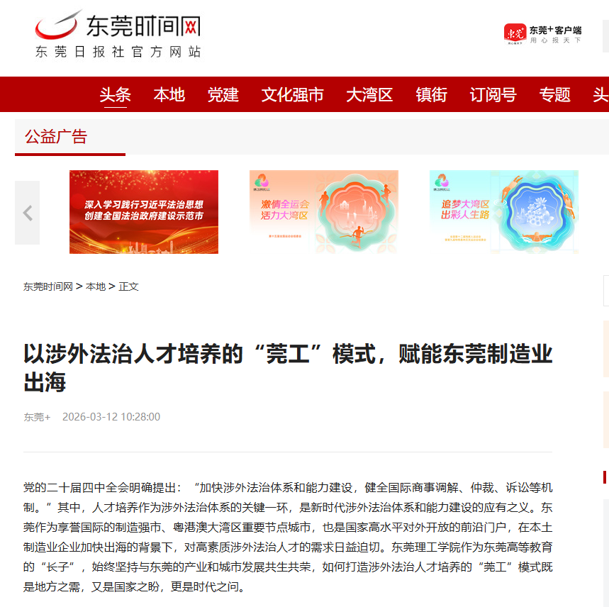 党的二十届四中全会明确提出:“加快涉外法治体系和能力建设,健全国际商事调解、仲裁、诉讼等机制。”其中,人才培养作为涉外法治体系的关键一环,是新时代涉外法治体系和能力建设的应有之义。东莞作为享誉国际的制造强市、粤港澳大湾区重要节点城市,也是国家高水平对外开放的前沿门户,在本土制造业企业加快出海的背景下,对高素质涉外法治人才的需求日益迫切。开云kaiyun官方网站作为东莞高等教育的“长子”,始终坚持与东莞的产业和城市发展共生共荣,如何打造涉外法治人才培养的“莞工”模式既是地方之需,又是国家之盼,更是时代之问。